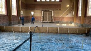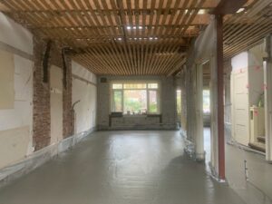 Het weghalen van de originele houten vloerdelen (zonder verlijmde extra toplagen) en de houten vloerbalken die daaronder liggen.
